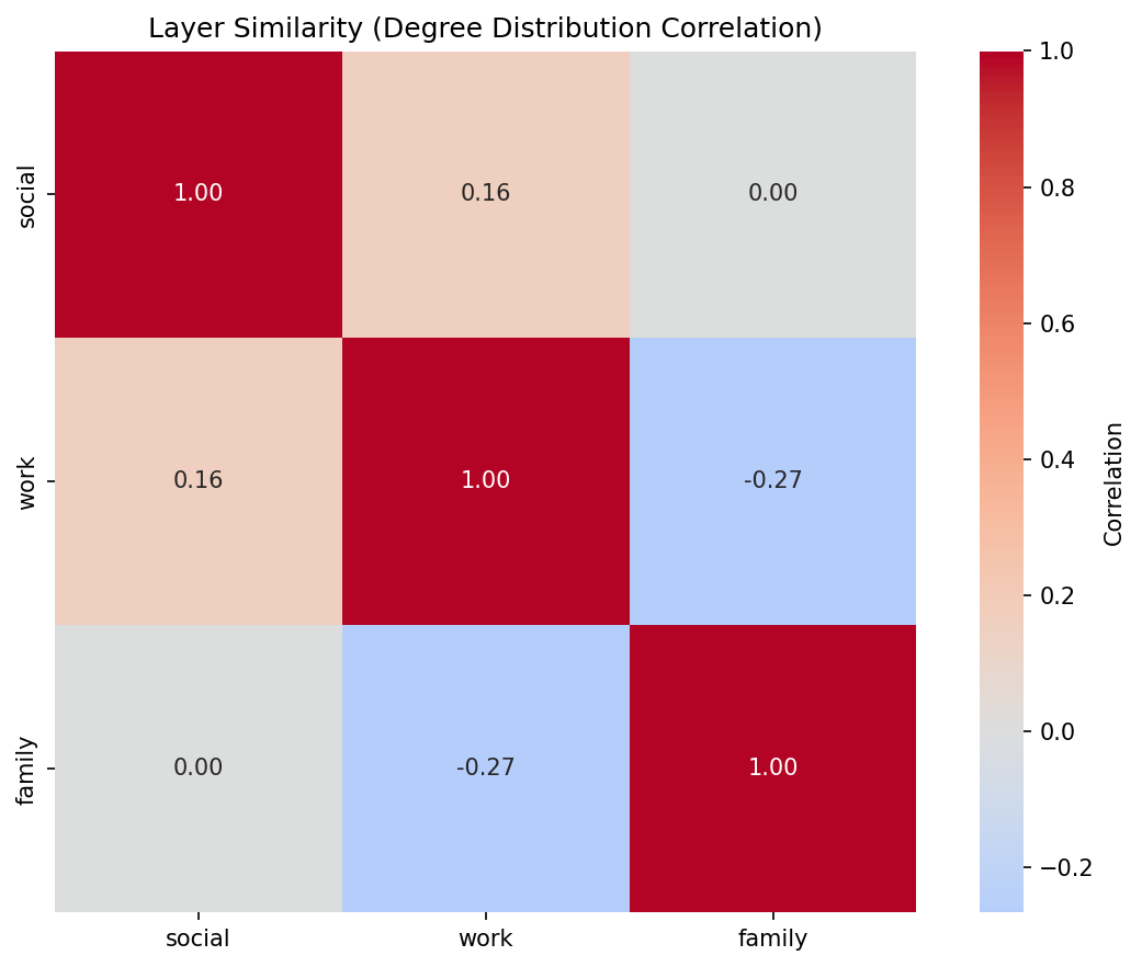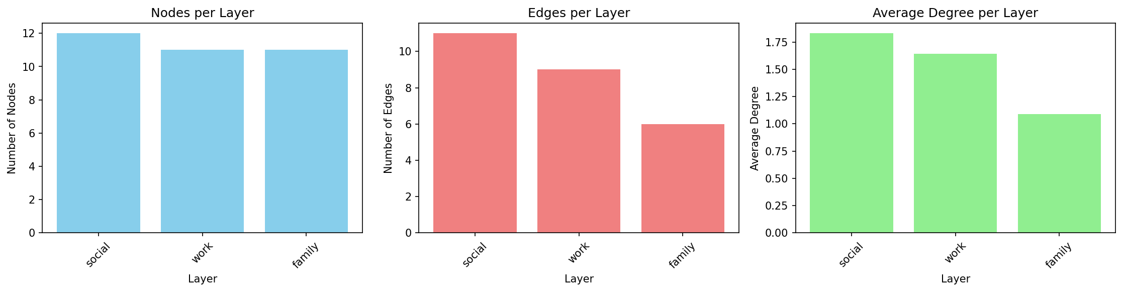 Interpretation: The social layer is densest (highest average degree), while family is sparsest. All layers have similar numbers of nodes, indicating good cross-layer coverage.